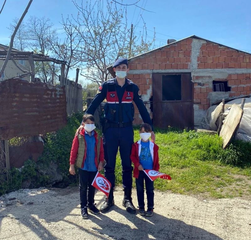 Ekipler 23 Nisan’ı evinde kutlayan çocuklara bayrak hediye ederek günün anlam ve önemini vurgulayıp, sevinçlerine ortak oldu. Bayraklarını alan çocuklar jandarma personellerine teşekkürlerini iletirken sevinçleri gözlerinden okundu.