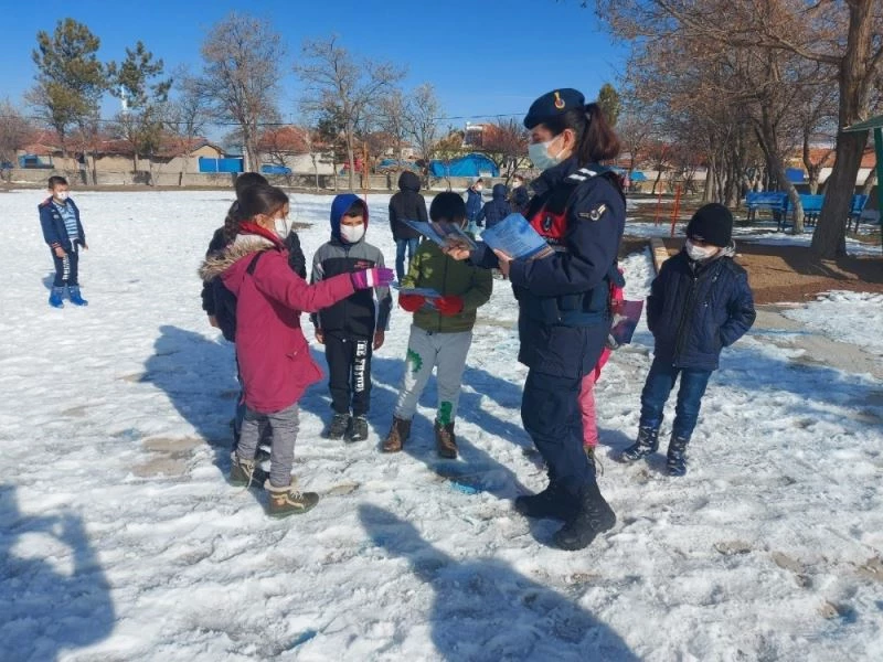 Öğrencilere çocuk dergisi dağıtan jandarma ekipleri daha sonra Toprakpınar köyünde yalnız yaşayan bir kadını ziyaret ederek soba zehirlenmesi ve dolandırıcılara karşı uyardı.