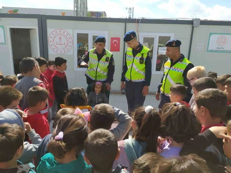 Malatya’nın Doğanşehir ilçesinde konteyner kentte yerleştirilen depremzede ailelerin çocuklarına jandarma tarafından uygulamalı trafik eğitimi verildi.
