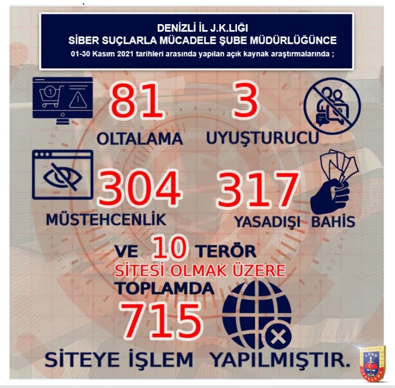 Denizli İl Jandarma Komutanlığı Siber Suçlarla Mücadele Şube Müdürlüğünce, 2021 Kasım ayı içerisinde; uyuşturucu ve uyarıcı maddeyi özendirme, yasadışı bahis, terör örgütü propagandası, müstehcen içerikli suç paylaşımlarını ve zararlı yazılım barındıran oltalama (phishing) yöntemi kullanılarak dolandırıcılık, kimlik bilgilerini ele geçirme faaliyetleri içerisinde bulunan internet siteleri, sosyal medya hesaplarının tespiti ve erişiminin engellenmesi nedeniyle geniş çaplı çalışma başlatıldı. Yapılan çalışmalar sonrası; yurtdışı üzerinden yayın yapan 317 adet yasadışı bahis, 304 adet müstehcen, 81 adet oltalama (phishing), 10 adet terör örgütü propagandası ve 3 adet uyuşturucu ve uyarıcı maddeyi özendirme içerikli paylaşımların olduğu internet sitesi ağı adresleri tespit edildi.