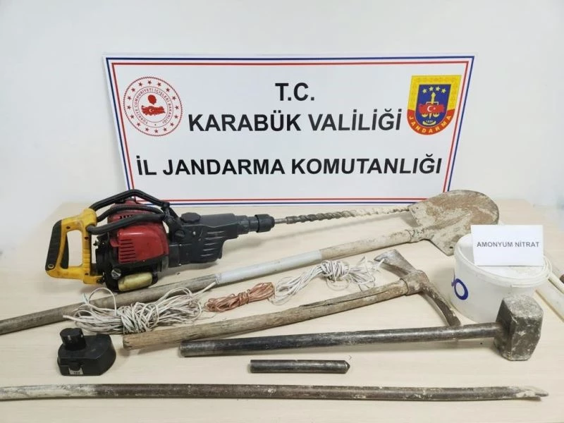 Edinilen bilgiye göre, Karabük İl Jandarma Komutanlığı ekiplerince Merkez ilçe Yukarı Kızılcaören köyü ormanlık alanında tarihi eser bulmak için kaçak kazı yapan C.Y. (35) ve R.S. (34) suçüstü yakalandı. 2 şahıs gözaltına alınırken, kazıda kullanılan beton delici ile kazma, kürek, balyoz ve manivelanın yanı sıra, patlatma yapmak üzere amonyum nitrat, elektrik kablosu ve bataryaya da el koyuldu. Jandarma ekiplerince ifadeleri alınan 2 kişi, sevk edildikleri adliyede savcılık tarafından tutuksuz yargılanmak üzere serbest bırakıldı.