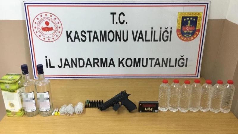 Edinilen bilgiye göre, Kastamonu İl Jandarma Komutanlığı ekipleri, Cide ilçesine bağlı Baltacı köyünde M.S. isimli şahsın kaçak içki imalatında kullanılan malzemeleri temin ederek kaçak içki imal ettiği tespit edildi. Bunun üzerine jandarma ekiplerince şahsın evinde ve aracında yapılan aramada; 2 adet etil alkol şişesi, 32 adet anason tüpü, 2 adet tahıl tüpü, 7 adet 0.5 litrelik pet şişe içinde satışa hazır kaçak içki, 1 adet faturasız kuru sıkı tabanca ile 11 adet fişek ele geçirildi.