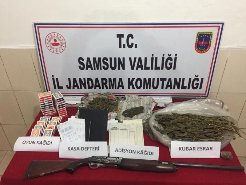 Öte yandan Y.A. isimli şahsın evinin eklentilerinde yapılan aramada vitrin olarak tabir edilen dolapta poşet içerisinde yaklaşık 1 kg kubar esrarın yanı sıra ev ve bahçede yapılan aramada 3 adet adisyon fişi, 32 adet iskambil kağıdı, 10 adet boş senet, 2 adet kasa defteri ve ruhsatsız av tüfeği ele geçirildi.