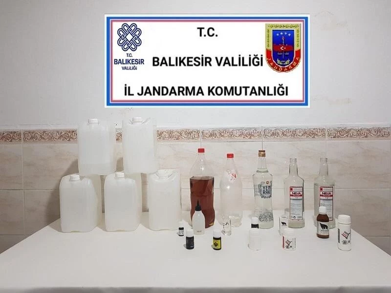 Balıkesir’in Bandırma ilçesinde jandarma ekipleri sahte içki imal edildiğini tespit ettikleri bir eve yaptıkları operasyonda sahte alkol ve içki yapımında kullanılan katkı maddesi ele geçirdi.