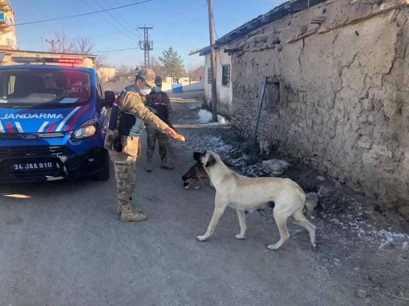 Erzincan’ın Çayırlı ilçesinde jandarma ekipleri, sokak hayvanlarına mama ve su desteğinde bulundu.