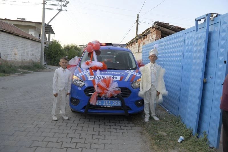 Manisa’nın Saruhanlı ilçesinde şehit Jandarma Uzm. Çavuş Şevket Kolonkaya’nın 2 oğlunun sünnet düğününde sünnet otomobili olarak jandarma aracı süslendi. Jandarmanın jesti hem çocukları hem de ailesini mutlu etti.