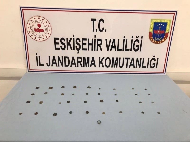 KOM Şube ve Çifteler İlçe Jandarma Komutanlığı ekipleri birlikte düzenlediği operasyon sonucu şüpheliler yakalandı. Şüphelilerin üzerlerinde ve yakalandıkları araçta yapılan arama sonucunda tarihi eser olduğu değerlendirilen 36 adet Roma Dönemi’ne ait bronz sikke ve 1 adet bronz yüzük ele geçirildi. Objeler Eskişehir Müze Müdürlüğü’ne teslim edilmek üzere muhafaza altına alındı.