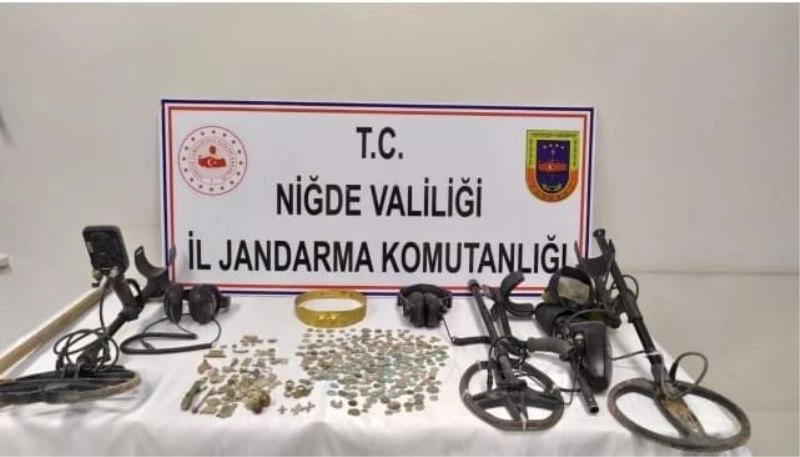 Niğde’de jandarma ekipleri tarafından yapılan çalışmalarda 390 adet sikke, 90 adet tarihi obje, 9 adet yüzük, 3 adet haç ve 1 adet taç ele geçirdi.