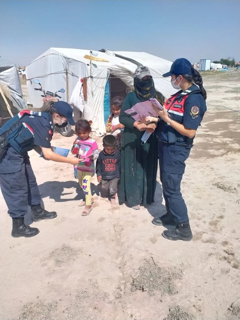 Aksaray’da İl Jandarma Komutanlığı Asayiş Şubesi Suç Kısmı, Aile İçi Şiddetle Mücadele ve Çocuk Kısım Amirliği ekipleri, nüfusunun yüzde 80’inin tarım ve hayvancılıktan geçimini sağladığı kentte tarım arazilerine inerek mevsimlik tarım işçisi kadınlarla bir araya geldi. Tarım işçisi kadınları ziyaret ederek sohbet eden jandarma ekipleri, KADES uygulaması hakkında broşürler dağıttı. Kadına yönelik şiddetle mücadele kapsamında gerçekleştirilen çalışmada kent genelinde bulunan binlerce kadın tarım işçisi çadırlarında ziyaret edildi. Jandarma ekipleri tarafından kadın işçilere kadına yönelik şiddet konusunda da geniş çaplı eğitim verildi. Ayrıca ekipler mevsimlik tarım işçilerinin çocuklarına Jandarma Çocuk Dergisi ve boyama kitapları hediye etti.