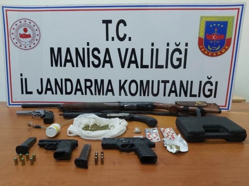 Manisa’nın Alaşehir ilçesinde jandarma ekiplerinin 6 ayrı adrese eş zamanlı düzenlediği operasyonda çok sayıda uyuşturucu madde ile ruhsatsız silahlar geçirirken, 5 kişi gözaltına aldı.
