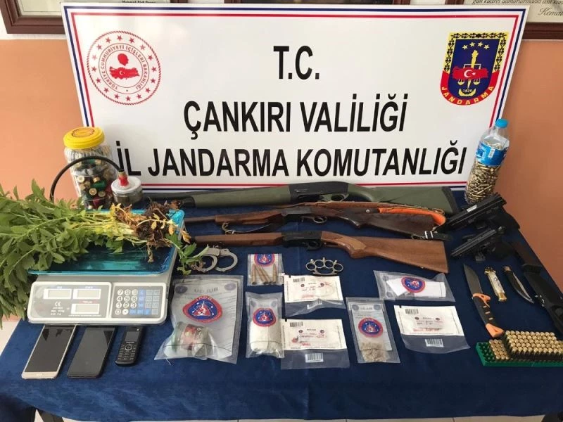 Çankırı İl Jandarma Komutanlığı ekipleri, uyuşturucu madde imalatı ve ticareti, kullanmak için uyuşturucu madde bulundurma suçlarının önüne geçilmesi için çalışma başlattı. Bu kapsamda istihbaratları değerlendiren ekipler, Atkaracalar, Kurşunlu, Çerkeş ve Bayramören ilçelerinde 6 farklı adrese operasyon düzenledi. Çok sayıda ekibin katıldığı operasyonda 200 gram esrar, 11 gram kenevir tohumu, 2 adet ruhsatsız tabanca, 2 adet şarjör, 350 adet tabanca fişeği, 3 adet ruhsatsız av tüfeği, 143 adet av fişeği, 3 adet sustalı bıçak, 1 adet muşta, 1 adet maşonet kelepçe, 1 adet elektronik terazi, 3 adet uyuşturucu kullanımı için aparat, 1 adet esrar üretme değirmeni, 5 kök kenevir, 4 adet tüfek mermisi, 3 adet cep telefonu, 1 adet sim kart ile birlikte çok sayıda uyuşturucu kullanımında kullanılan alüminyum folyo ele geçirildi.