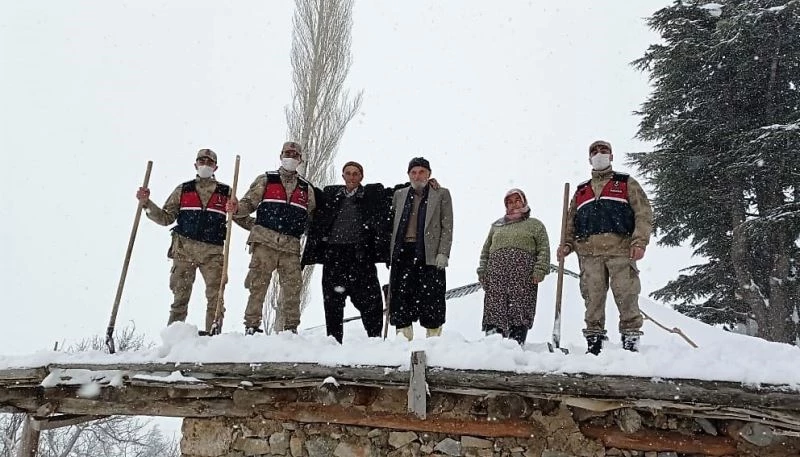 Kahramanmaraş’ta kar yağışı nedeniyle evinin çatısını temizlemeye çalışan yaşlı adamın yardımına jandarma ekipleri koştu.