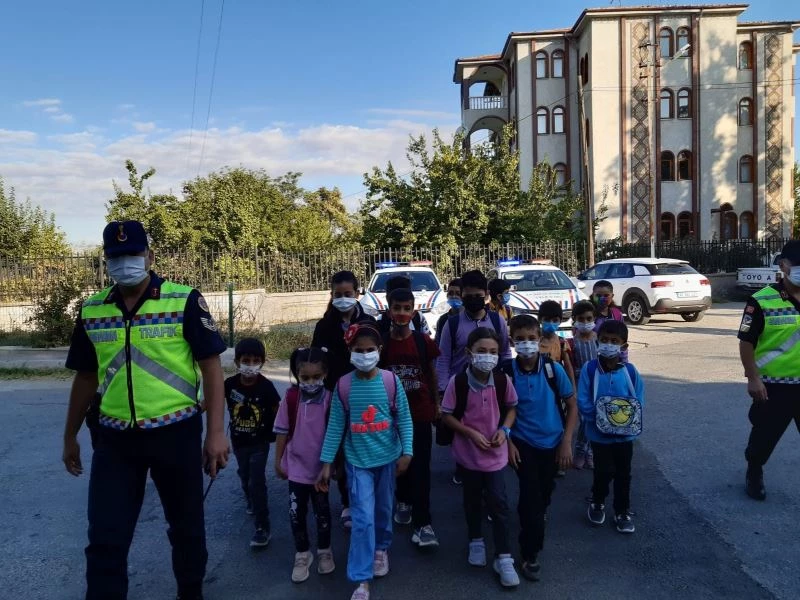 "Yayalar Kırmızı Çizgimiz" uygulaması kapsamında öğrencilere kırmızı düdük ile jandarma temalı maske, cetvel, boyama kitabı, şapka ve tişört dağıtıldı.