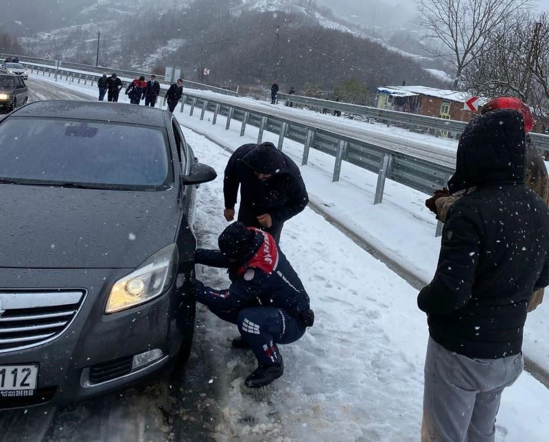 Zonguldak İl Jandarma Komutanlığına bağlı ekipler, yoğun kar yağışı nedeniyle yolda mahsur kalan vatandaşlara zincir takmaları konusunda yardımcı oldu. Ekipler yolda kalan sürücülere zincir takma konusunda destek olarak trafikte kış tedbirleri ile ilgili bilgilendirme yaptı.