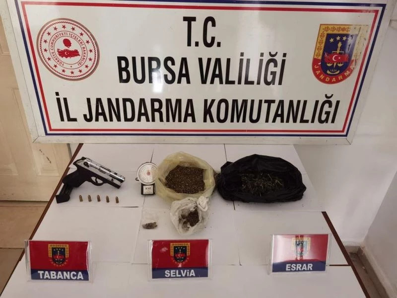 Bursa genelinde zehir tacirlerine yönelik operasyon düzenleyen İl Jandarma Komutanlığı ekipleri, uyuşturucu madde satışı yapan Ş.H., S.B. ve O.Ü.’yü düzenlediği operasyonla suçüstü yakaladı. Şahısların evlerinde yapılan aramalarda 950 gram selvi, 265 gram esrar, 1 adet ruhsatsız tabanca, 1 adet hassas terazi ve çok sayıda fişek ele geçirdi. Operasyon esnasında evde bulunan A.O.’nun GBT sorgusunda 8 farklı suç kaydının olduğu tespit edildi. Yakalanan Ş.H., S.B., O.Ü. ve A.O. gözaltına alındı.