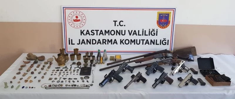 Edinilen bilgiye göre, Kastamonu İl Jandarma Komutanlığı ekiplerince tarihi eser kaçakçılığının önlenmesine yönelik yapılan araştırmalar neticesinde ,Taşköprü ilçesinde yaşayan F.E. isimli şahsın evine operasyon düzenlendi. Operasyonda yapılan aramalarda, tarihi eser niteliğinde 65 adet obje, 26 adet sikke, 19 adet yüzük, 14 adet kadeh, 1 adet Bakraç, 1 adet tarihi eser rehberi, 1 adet tarihi eser niteliği olduğu değerlendirilen tabanca ile 6 adet ruhsatsız tabanca, 3 adet ruhsatsız av tüfeği, 41 adet tabanca fişeği, 45 adet av tüfeği kartuşu ve çok sayıda tabanca yapımında kullanılan namlu parçaları ve tamirat malzemeleri ele geçirdi.