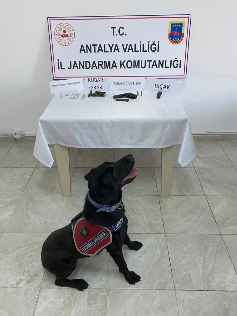 Alanya Cumhuriyet Başsavcılığı talimatları doğrultusunda Gazipaşa İlçe Jandarma Komutanlığı, Kaçakçılık ve Organize Suçlarla Mücadele Şube Müdürlüğü ekipleri, Narkotik ve Bomba Köpek unsurlarıyla ile birlikte çalışma yürüttü. Güney Jandarma Karakol Komutanlığı Yol Kontrol Noktasında bir araç ekiplerin şüphesi üzerine durduruldu. Araç sürücüsü H.T. ve araçta yolcu olarak bulunan R.E. isimli şahısların bulunduğu araçta yapılan aramada, bir adet tabanca ve tabancaya takılı halde içerisinde sekiz adet tabanca fişeği, bir adet bıçak ve bir adet uyuşturucu madde içme aparatı, on iki adet uyuşturucu hap ve yirmi gram esrar ele geçirildi. Olayla adli işlem başlatıldı.