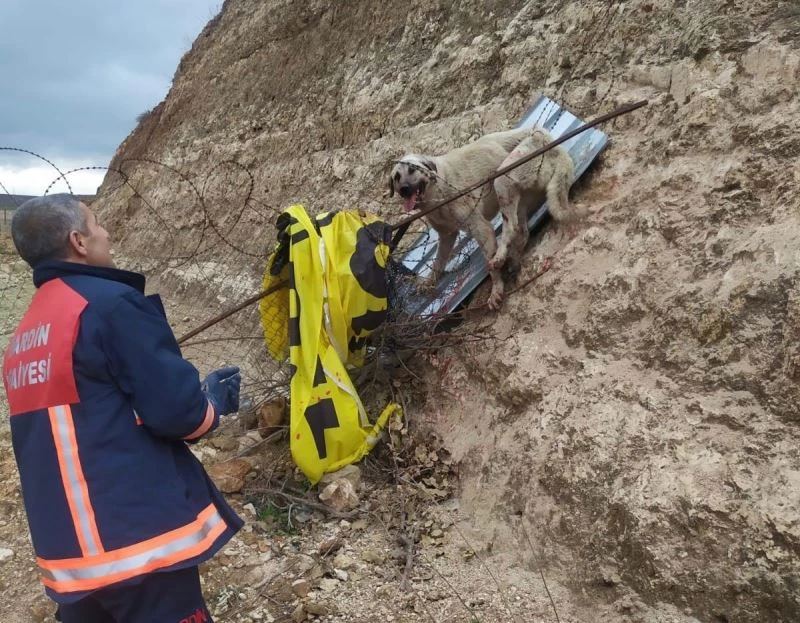 Mardin Büyükşehir Belediyesine bağlı, Midyat İtfaiye Grup Amirliği ekipleri tarafından jiletli tellere sıkışan köpek kurtarıldı.