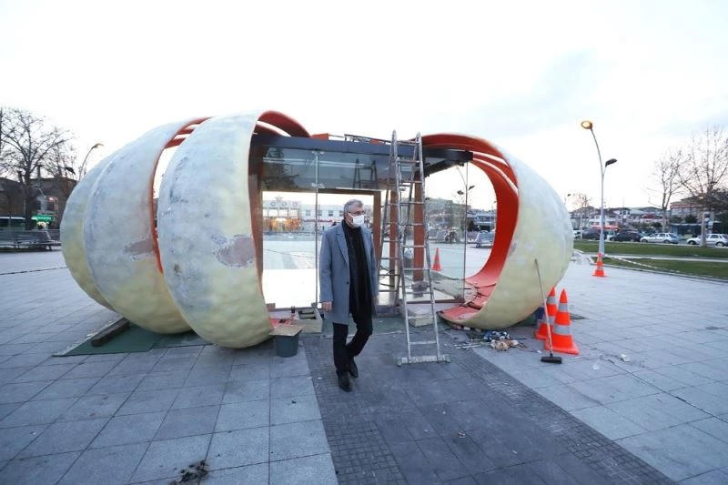 Sakarya Büyükşehir Belediyesi tarafından Gar Meydan’ında yapımı devam eden kabak motifli satış ofisini, görenleri şaşırtıyor.