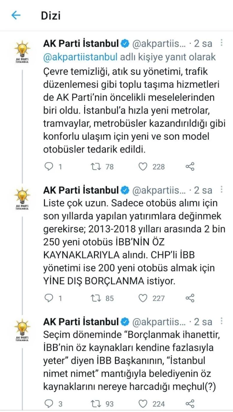 AK Parti İstanbul İl Başkanlığı resmi sosyal medya hesabından ise CHP’li Gürsel Tekin’in paylaşıma cevap verildi. Tekin’nin, “AK Parti döneminde toplu taşımaya gereken yatırım yapılmadı” şeklindeki sözlerine karşılık yayınlanan açıklamada şu ifadelere yer verildi: