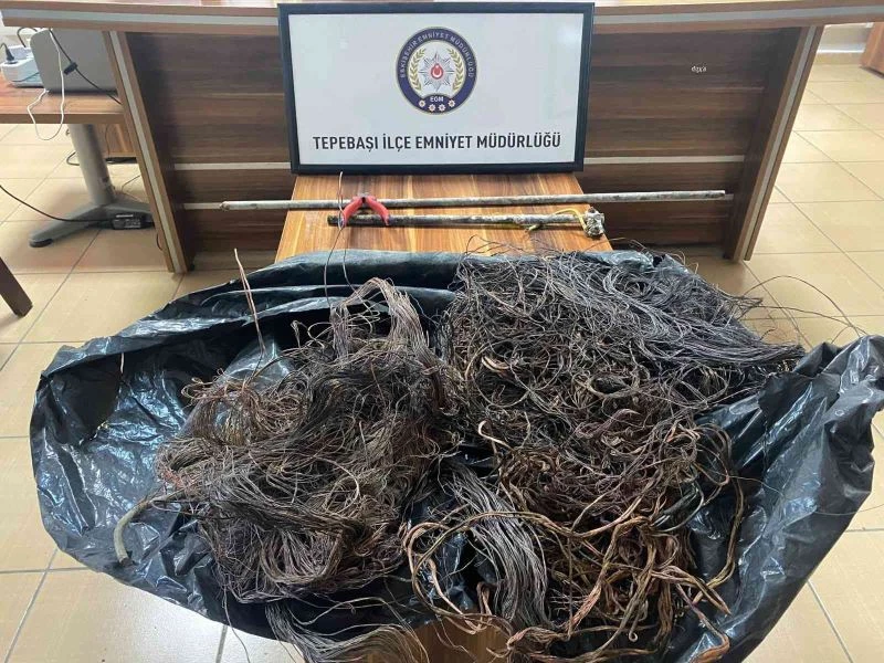 Edinilen bilgilere göre, Tepebaşı İlçe Emniyet Müdürlüğü ekiplerince kablo yakan şahısların olduğu ihbarı üzerine çalışma başlatıldı. Adrese giden ekiplerin yaptığı araştırmada park halinde bulunan şüpheli araç içerisinde M.B. ve C.E.K., isimli şahısları yakaladı. Araç ve çevresinde yapılan incelemede 9 kilogram 120 gram soyulmuş bakır kablo, 2 adet demir çubuk, 1 adet topraklama demiri, 2 adet musluk bataryası ve 1 adet keski ele geçirildi.