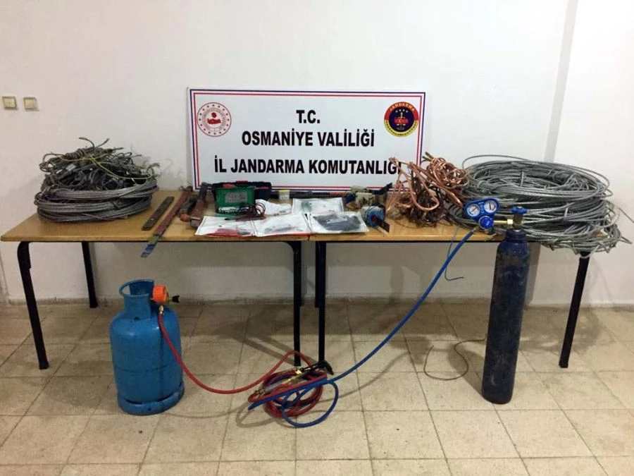 Osmaniye'de, elektrik panosu ve enerji nakil hattından kablo hırsızlığı yapmaya çalışan 2 kişi suçüstü yakalandı. Osmaniye İl Jandarma Komutanlığı ekiplerince, Merkez İlçe Çağşak köyünde bulunan mermer ocağına ait elektrik panosu ve enerji nakil hattından kablo hırsızlığı yapıldığı yönünde alınan ihbar üzerine harekete geçildi. Bölgeye giden jandarma ekiplerince yapılan çalışmada iki şüpheli yakalanarak gözaltına alındı.Çevrede yapılan aramada ise şüphelilerin suçla kullandıkları oksijen tüpü, oksijen kaynağı ve muhtelif malzemeler ile çaldıkları 450 metre alüminyum enerji nakil kablosu ve 60 metre bakır elektrik kablosu ele geçirildi.