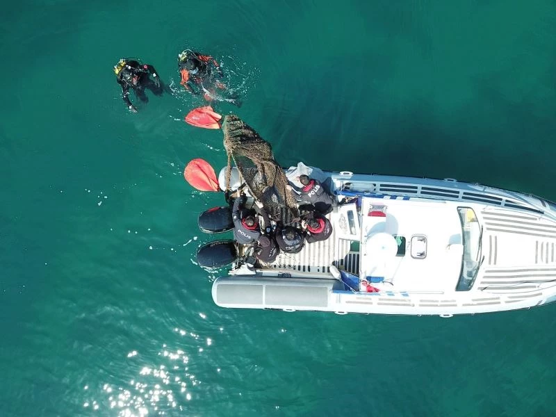 Yeni olduğu belirlenen trol ve algarna düzenekleri, 4 saat süren çalışma sonunda EGESÜF Gemisi’ne çekildi.