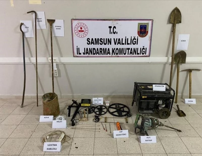 Alınan bilgiye göre, Samsun İl Jandarma Komutanlığı ile Terme İlçe Jandarma Komutanlığı ekipleri, Terme’nin Cılar Mahallesi’nde izinsiz kazı yapılacağı bilgisi üzerine bölgede detaylı araştırma ve inceleme başlattı. Yapılan incelemeler sonucunda Cılar Mahallesi sınırları içerisinde F.K., C.Ş., S.I., Y.A., F.I., Ö.Ş. ve M.H. izinsiz kazı yaparken suçüstü yakalandı. Olay yerinde 1 adet jeneratör, 1 adet dedektör ve ekipmanları, 1 adet cep dedektörü ve birçok kazı malzemesi ele geçirildi.