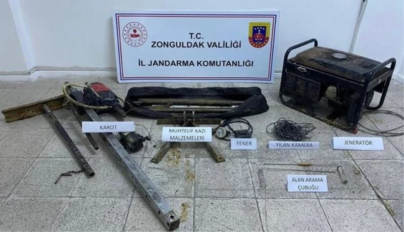 Edinilen bilgiye göre Zonguldak İl Jandarma Komutanlığı ekiplerince Alaplı ilçesinde 5 şüpheli; kaçak kazı yaptığı esnada suçüstü yakalandı. Düzenlenen operasyonda 1 adet jeneratör, 1 adet kaya delme makinesi, 1 adet yılan kamera, 1 adet hidrofor makinesi, 1 adet fener, 2 adet alan arama çubuğu, 6 adet burgu boru ele geçirildi. Cumhuriyet Başsavcılığının talimatları çerçevesinde ifadesi alınan şüpheliler serbest bırakıldı.