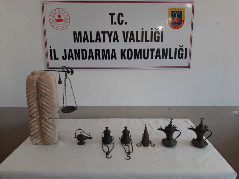 Edinilen bilgiye göre, Jandarma tarafından Akçadağ İlçesinde bir kişinin evinde yapılan aramada, eski dönemlere ait iki adet buhardanlık, bir adet eski hassas terazi, bir adet kandil, iki adet maşrapa, bir adet bronzdan yapılı gözyaşı şişesi ve bir adet eski medeniyetlere ait işlemeli taş ele geçirildi.