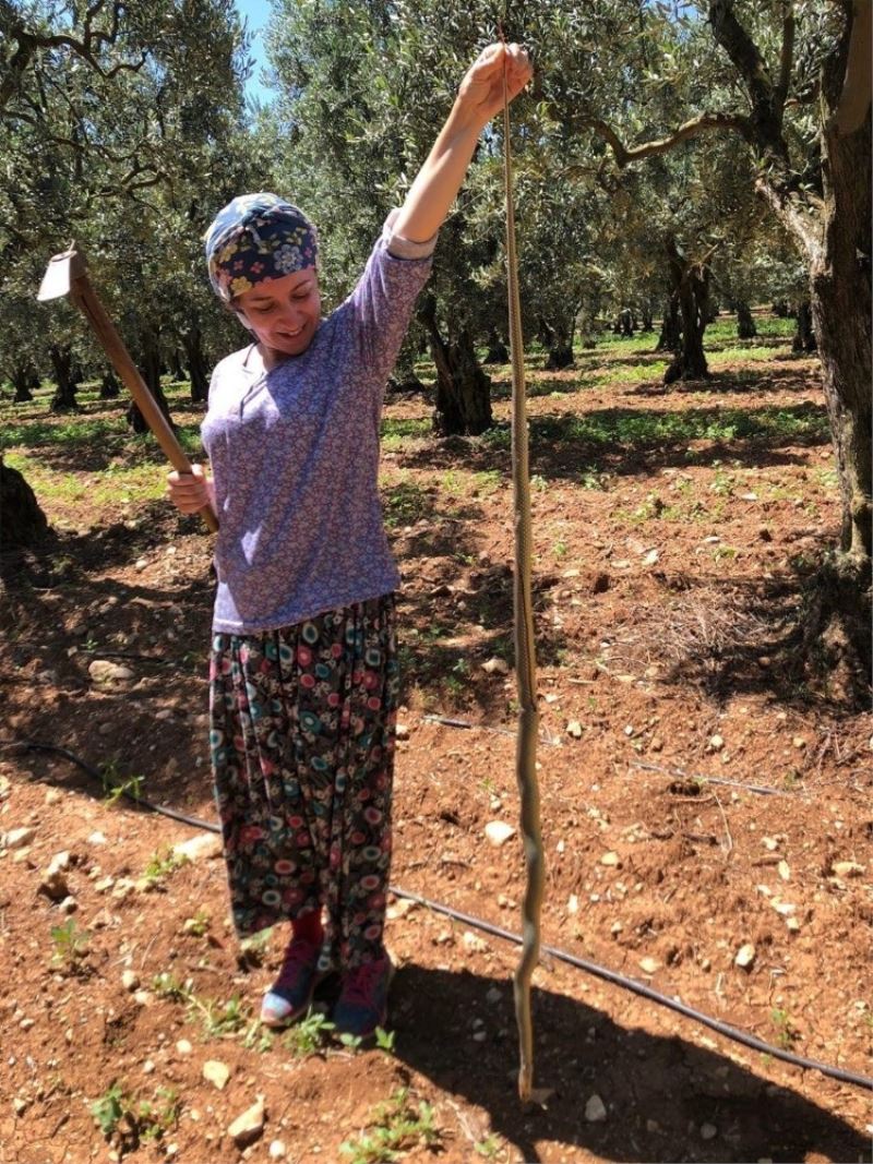 Bursa’nın İznik ilçesinde bir kadın çiftçi tarlasında boyundan büyük yılan yakaladı.