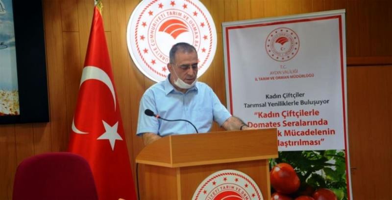 Aydın’da bu yıl uygulanan “Kadın Çiftçilerle Domates Seralarında Biyoteknik Mücadelenin Yaygınlaştırılması” projesi kapsamında kadınlara yönelik eğitim toplantısı düzenlendi.