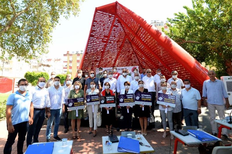 Muratpaşa Belediyesi Meclisi, artan kadın cinayetlerine dikkat çekmek için, üzerinde öldürülen kadınların adının yazılı olduğu 6 metrelik "Al Yazma Anıtı" önünde toplandı.