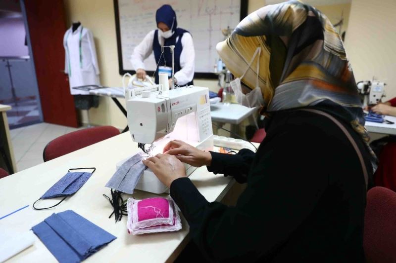 Bağcılar Belediyesi Kadın ve Aile Kültür Sanat Merkezi Giyim Üretimi Atölyesi’nde eğitim gören kursiyerler, pamuklu kumaştan maske üretimi yaparak ekonomik kazanç sağlıyor. Çoğunluğu ev hanımlarından oluşan kursiyerler, her zevke uygun istenilen ölçü, renk ve modelden maske siparişi de alıyorlar.
