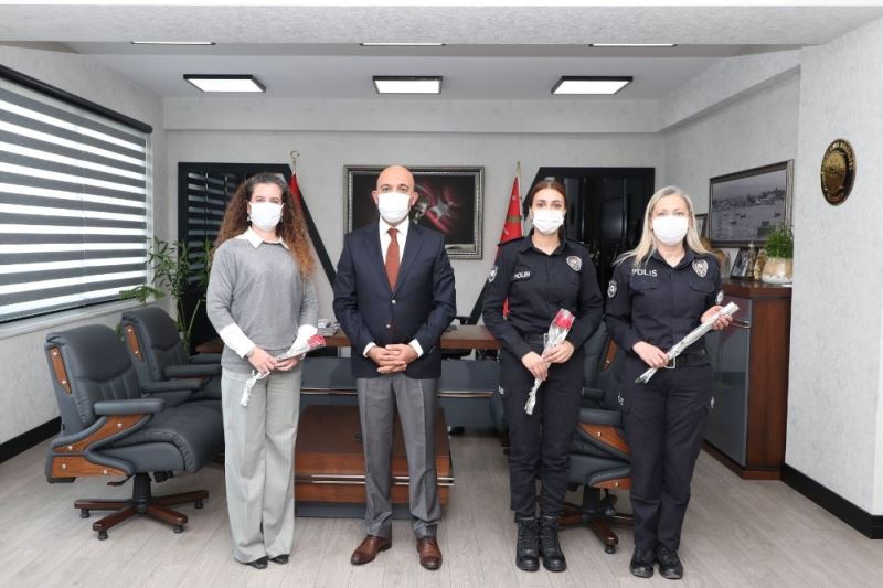 Mersin İl Emniyet Müdürü Mehmet Şahne, 8 Mart Dünya Kadınlar Günü dolayısıyla kadın meslektaşlarına çiçek verdi.