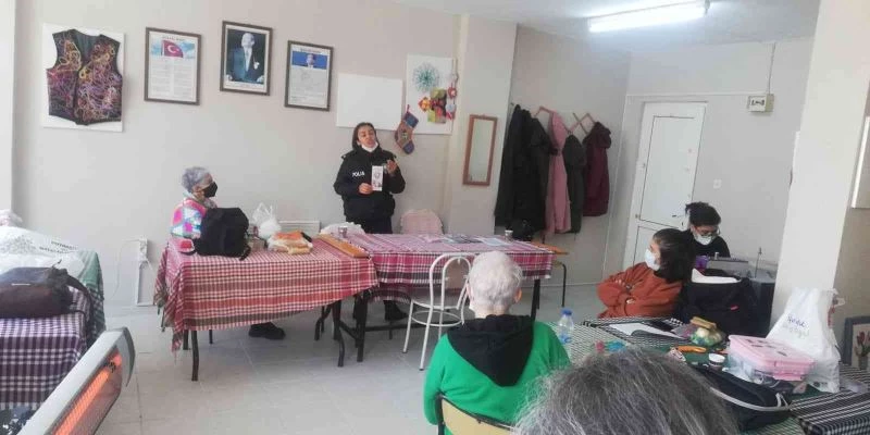 Burhaniye İlçe Emniyet Müdürlüğünde görevli Komiser Yardımcısı Esra Başol ve Polis Memuru Türkan Yamiç, Halk Eğitimi Merkezi kurslarına katılan kadınları ziyaret etmeye devam ediyor. Dün de İskele Mahallesindeki El Sanatları Kursuna giden kadın polisler, kurs öğretmeni Aliye Çolak ve kursiyer kadınlarla toplantı yaptı. Kadınlara broşürler dağıtan Esra Başol ve Türkan Yamiç, iletişim yoluyla dolandırıcılık, genel asayiş kuralları, güvenli internet kullanımı, Kades ve hırsızlık konularında bilgiler verdi. Esra Başol ve Türkan Yamiç’e teşekkür eden Kurs Öğretmeni Aliye çolak, “ Bizleri bilgilendirdiler, çok faydalı bilgiler edindik. Kendilerine teşekkür ediyoruz” dedi.