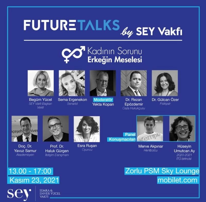 Yekta Kopan moderatörlüğünde düzenlenecek olan Future Talks by SEY Vakfı’nda, SEY Vakfı Başkan Vekili Begüm Yücel, Senarist Sema Ergenekon, Avukat Dr. Rezan Epözdemir, Psikiyatrist Dr. Gülcan Özer, Oyuncu Esra Ruşan, Akademisyenler Prof. Dr. Haluk Gürgen ve Doç. Dr. Yavuz Samur, yirmişer dakikalık konuşmalar yaparak kadın sorunlarını kendi alanlarında değerlendirecek.