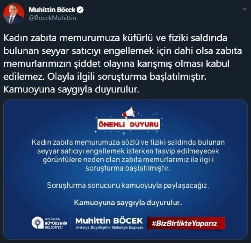 Sosyal medyada tepkiye yol açan görüntüler sonrası Antalya Büyükşehir Belediye Başkanı Muhittin Böcek bir açıklama yaptı. Böcek, konuya ilişkin soruşturma başlatıldığını belirterek, “Kadın zabıta memurumuza küfürlü ve fiziki saldırıda bulunan seyyar satıcıyı engellemek için dahi olsa zabıta memurlarımızın şiddet olayına karışmış olması kabul edilemez. Olayla ilgili soruşturma başlatılmıştır. Kamuoyuna saygıyla duyurulur” dedi.