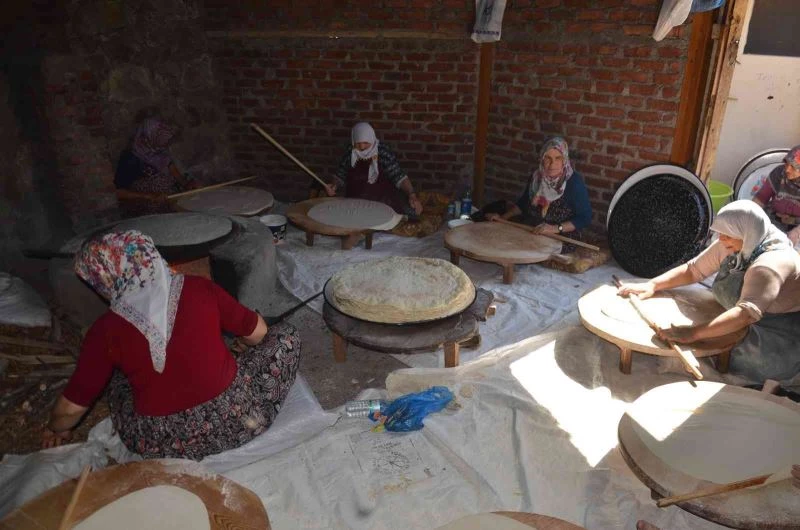 Çorum’un Oğuzlar ilçesinde sonbaharın gelmesiyle birlikte hummalı bir şekilde kış hazırlığına devam eden kadınlar, imece usulü yufka ekmeği yapımına başladı.