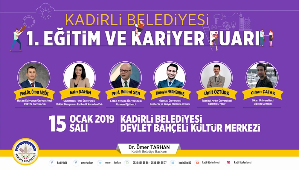 Belediye olarak bizlerde bu talep doğrultusunda ilçemizde ilki düzenlenecek Eğitim ve Kariyer fuarını tertip etme kararı aldık. 15 Ocak 2019 tarihinde ilçemizde bulunan Kadirli Belediyesi Devlet Bahçeli Kültür merkezinde düzenlenecek olan bu fuara katılıp, öğrencilere üniversitelerin tanıtımını yapma imkanı sunacağız. Gençlerimizin eğitim hayatlarına yön verecek tercihler hakkında bilgi sahibi olmaları amacıyla bu etkinliği düzenliyoruz. Şehrimizde ilk defa düzenlenen bu fuarla birlikte gençlerimiz okulların olduğu şehirlere gitmeden burada bilgi ve fikir alışverişinde bulunacaklar? dedi.