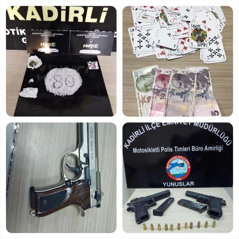 Uygulamalarda ayrıca 79,44 gram esrar ile 3 ruhsatsız tabanca ele geçirildi.
