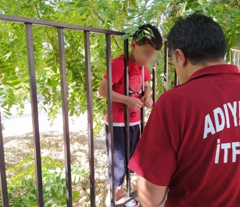 Adıyaman’da, kafasını demir korkuluklar arasına sıkıştıran çocuk, itfaiye ekiplerinin çalışmaları sonucu kurtarıldı.