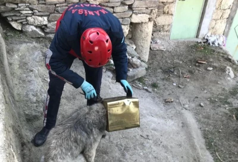 Manisa’nın Kula ilçesinde kafasını teneke bir kutuya sıkıştıran sokak köpeği, itfaiye ekiplerinin yardımıyla kurtarıldı.