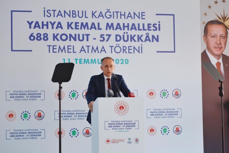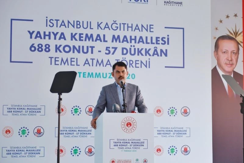Kentsel dönüşüm kapsamında Kağıthane Yahya Kemal Mahallesi’nde inşa edilecek 688 konut ve 57 dükkanın temel atma töreni gerçekleştirildi. Törene katılan Çevre ve Şehircilik Bakanı Murat Kurum, “Hedefimiz 2021 yılında İstanbul’da 100 bin konutu dönüştürmek“ dedi.