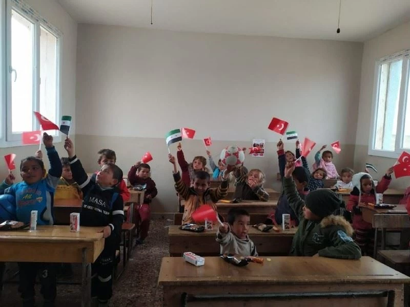 Barış Pınarı Bölgesi’nde görev yapan Türk askeri, çocuklara ve bölge halkına gıda ve kırtasiye yardımında bulundu.