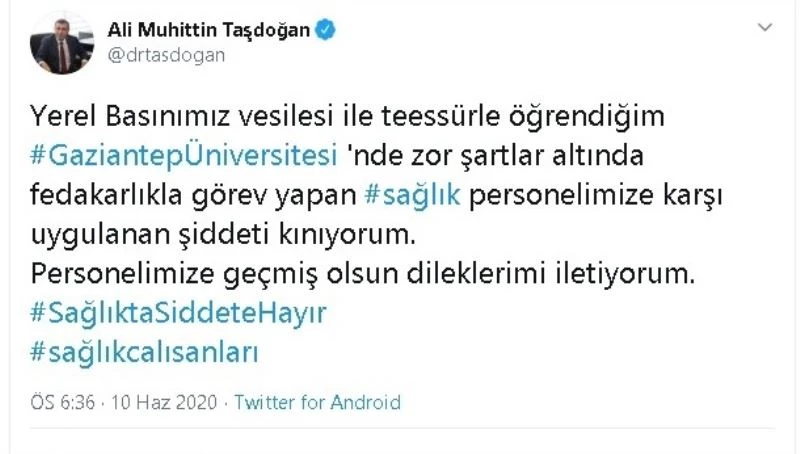 MHP Gaziantep Milletvekili Muhittin Taşdoğan, sosyal medyadan yaptığı paylaşımda, "Teessürle öğrendiğim Gaziantep Üniversitesi ’nde zor şartlar altında fedakarlıkla görev yapan sağlık personelimize karşı uygulanan şiddeti kınıyorum.Personelimize geçmiş olsun dileklerimi iletiyorum" ifadelerini kullandı.