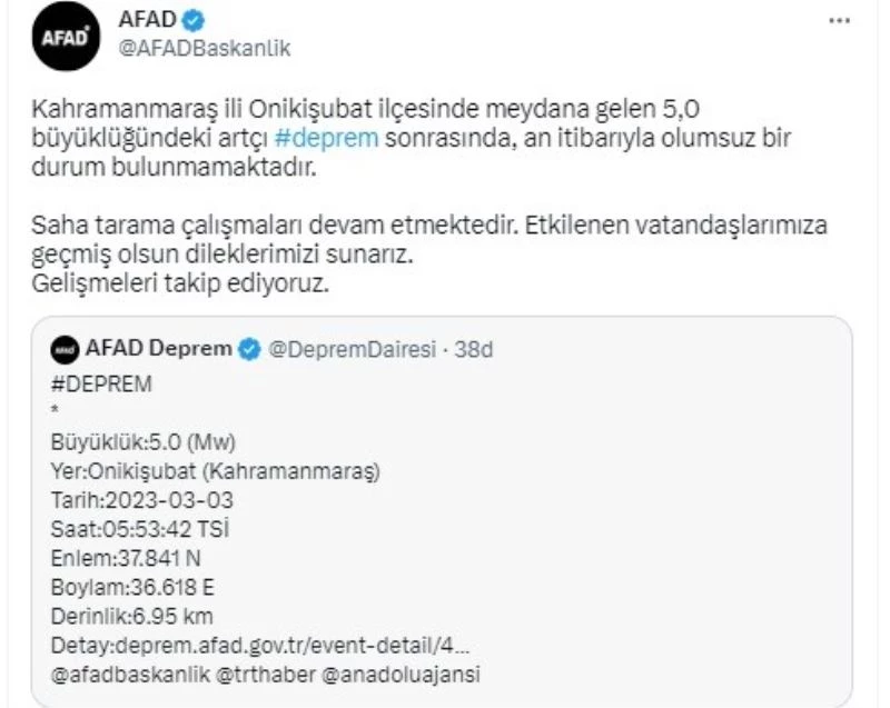 Kahramanmaraş merkezli iki büyük depremin yaşanmasının ardından sık tekrarlanan artçı sarsıntılar devam ediyor. Afet ve Acil Durum Yönetimi Başkanlığı (AFAD) yaptığı açıklamaya göre Kahramanmaraş’ın Onikişubat ilçesinde 5.0 büyüklüğünde bir deprem meydana geldi. Saat 05.53’te gerçekleşen deprem yerin 6.95 kilometre derinliğinde meydana geldi. AFAD depremin yaşanmasının ardından resmi sosyal medya hesabından “Kahramanmaraş ili Onikişubat ilçesinde meydana gelen 5,0 büyüklüğündeki artçı deprem sonrasında, an itibarıyla olumsuz bir durum bulunmamaktadır. Saha tarama çalışmaları devam etmektedir. Etkilenen vatandaşlarımıza geçmiş olsun dileklerimizi sunarız. Gelişmeleri takip ediyoruz” şeklinde bir açıklama yaptı.