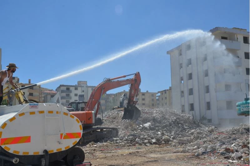 Efsus Turan ve Dedebaba mahallelerinde yürütülen çalışma kapsamında, ekipler, kontrollü şekilde iş makineleriyle hasarlı binaları yıkarken, vatandaşların tozdan olumsuz etkilenmemesi adına enkaz alanları sürekli sulanıyor.