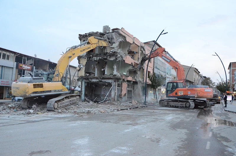 İlçe merkezinde 6 Şubat'ta meydana gelen afetin ardından yıkım kararı verilen yapılarda çalışmalar sürüyor.