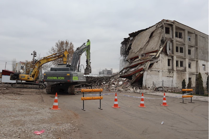 Güneşli Mahallesi'ndeki ağır hasarlı bina, iş makineleriyle yıkıldı.